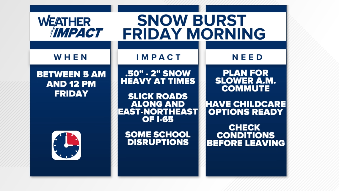 आत्तासाठी, मध्ये प्रभाव नैऋत्य इंडियाना दिसायला कमीत कमी, पण शुक्रवारी सकाळी प्रवास करणारा कोणीही मध्य, पूर्व किंवा ईशान्य इंडियाना राहिले पाहिजे हवामानाची जाणीव आणि हळू प्रवासाची योजना करा.
